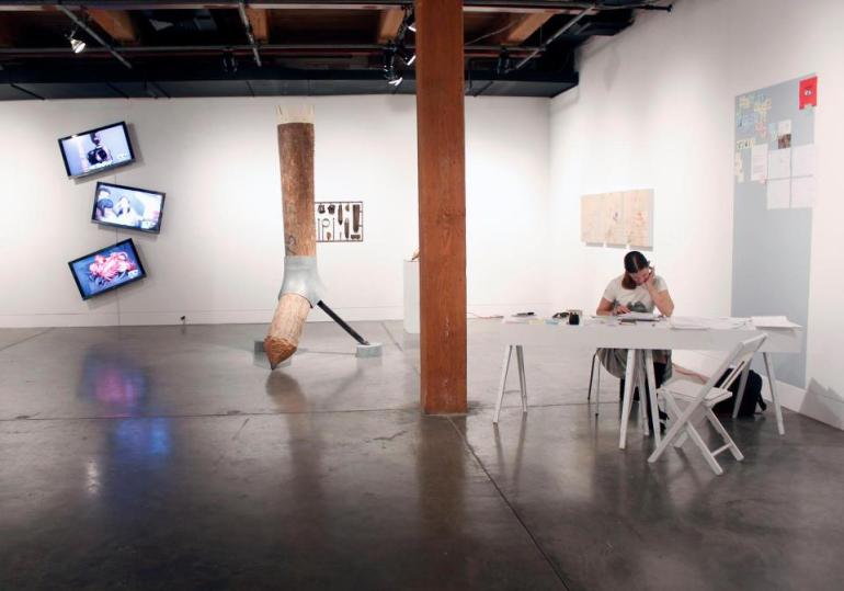 Posing Process (working title), is an open research project/performance organized for the occasion of the Spaces: Antenna, The Front, Good Children Gallery at the Contemporary Arts Center (CAC), New Orleans by Bosnian/Croatian artist Lala Raščić with Sophie T. Lvoff (both members of Good Children Gallery). A symbolic office space/studio, consisting of a simple desk, has been installed in the gallery at the CAC. This space will serve as a venue for the artist (and collaborators), which she will use during regular gallery hours to sit, think, meet, and develop a multi-media installation/performance. The work carried out will start from scratch with open ended and unpredictable results. A video installation will premiere as a special event at the closing of Spaces.