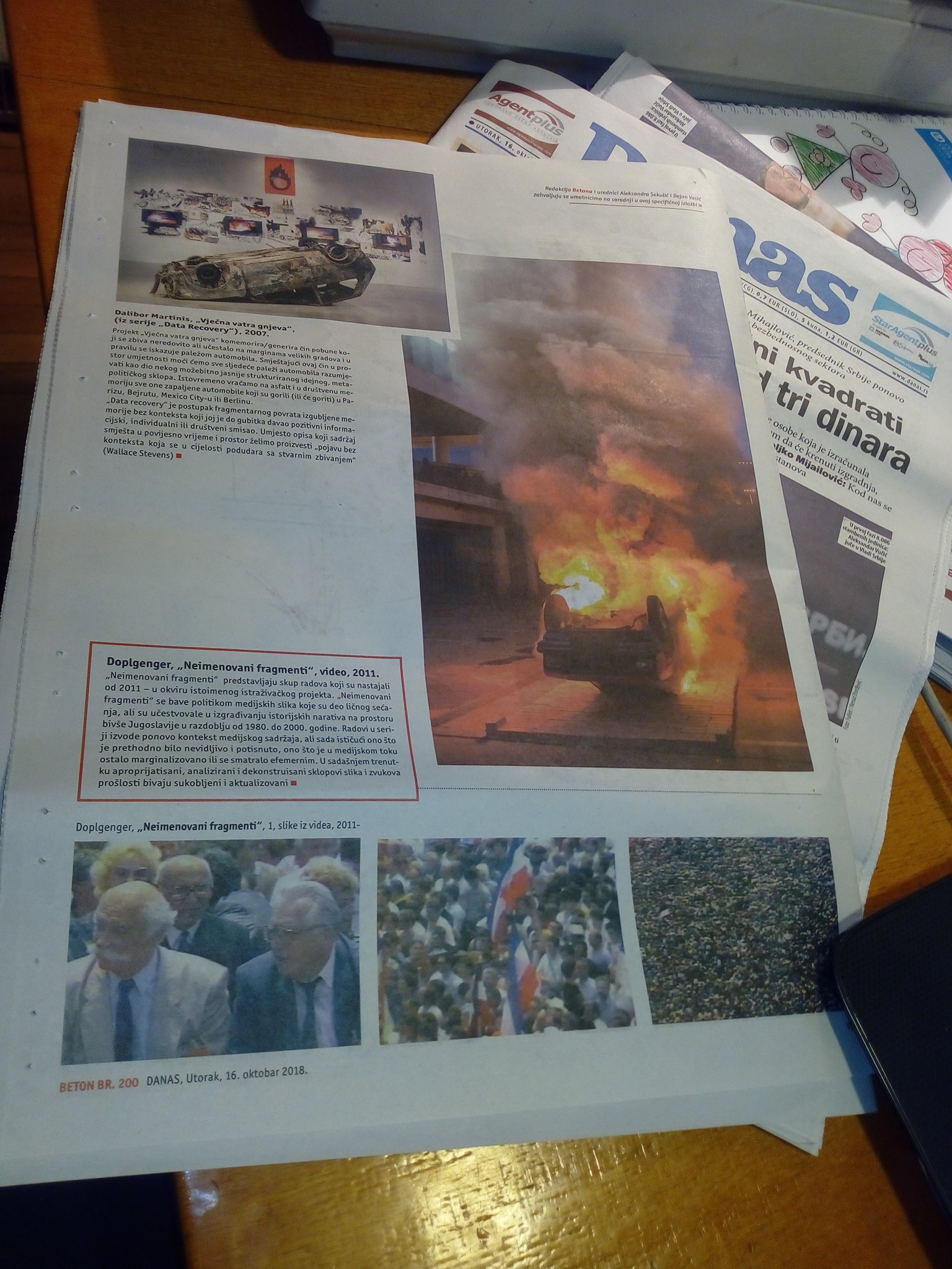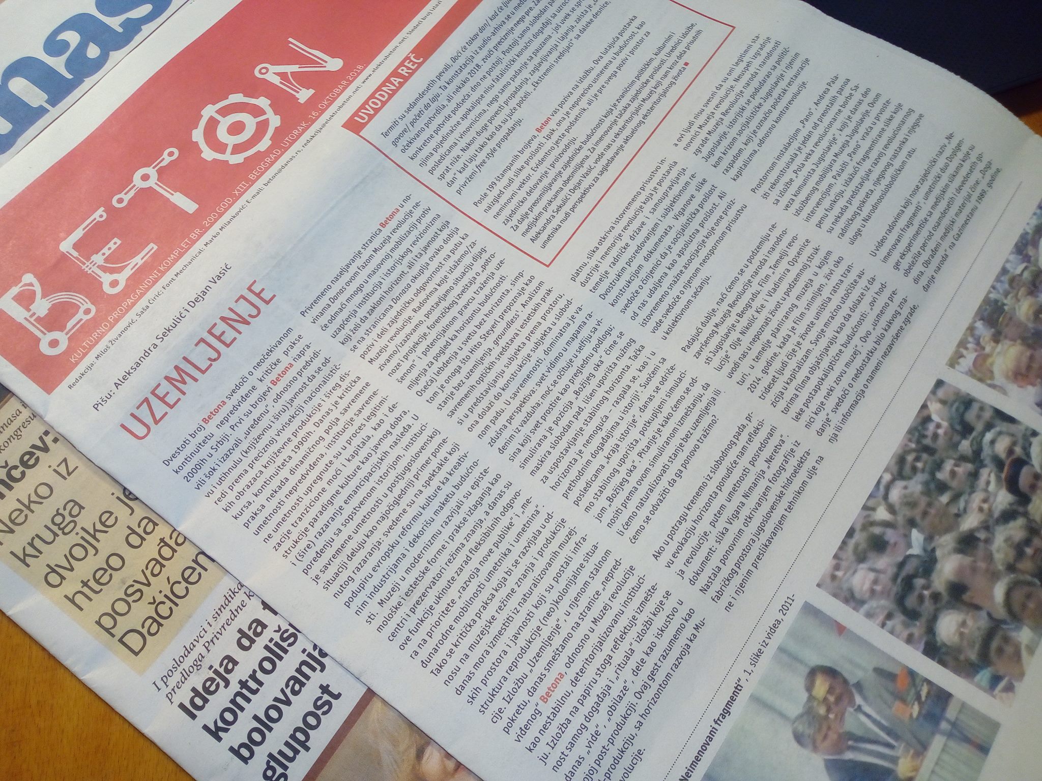 The Damned Damn was featured in the bicentennial, 200th issue of BETON, a cultural supplement in the daily newspaper Danas. The editors Aleksanda Sekulić and Dejan Vasić created a “newspaper exhibtion” featuring work by Vigan Nimani, Andrea Palašti, Olja Nikolić Kia i Vladimir Opsenica, Doplgenger, Pop-Mitic Darinka, Renata Poljak, Dalibor Martinis, Igor Grubić, Goran Dević, Lala Rascic, Igor Bošnjak.