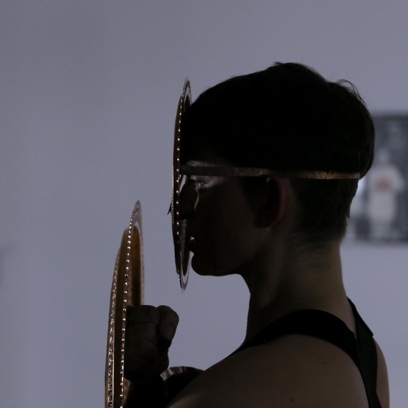 In Gorgo, a beheaded Medusa returns in the form of the artist’s body, protected by a copper armor. The Medusa, Gorgon:GORGO resurrects by way of ancient crafts and technology. The copper of the armor is the ancient material that has been worked for battle armors and households for centuries and is mired in the past. Rascic’s video brings the Medusa, with all her meta-baggage, into the present and a speculative future by the simple agency of sound amplification generated by the artists’ body and armor in performance. Gorgo’ s armor, crafted in collaboration with the only female coppersmith in Bosnia, apart from evoking a “cyborg in becoming” is treated in the space of the exhibition like the remains of an unknown, ancient, heroine in an archeological display.