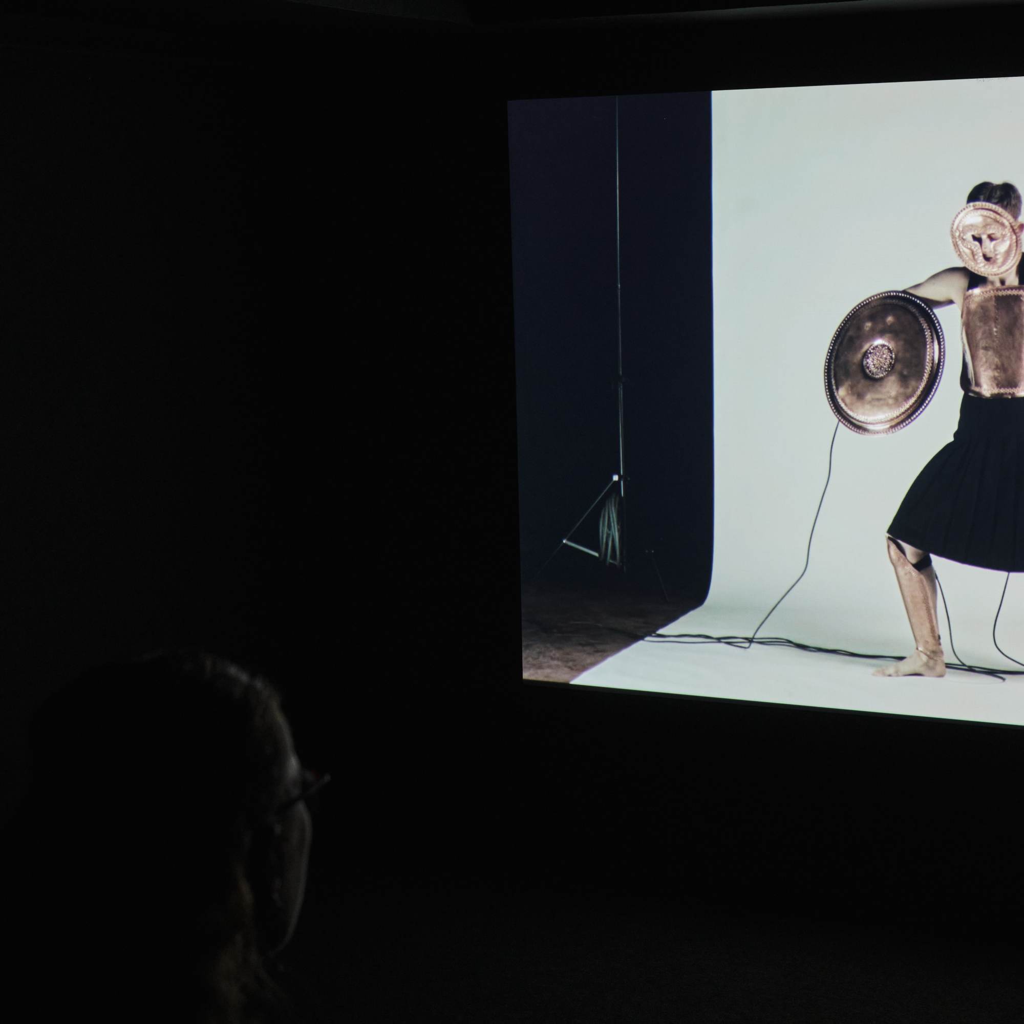 The exhibition title The Laugh of the Medusa is a homage to the eponymous essay by the French feminist and philosopher Hélène Cixous, in which she advocates women’s writing (écriture feminine). Cixous interprets the beheading of the mythical Gorgon/Medusa as a violent act of patriarchy, calling for the empowerment of feminine subjectivities. Claiming that women should be able to write their own history – from which they had been violently severed, like Medusa – Cixous concludes that women must put themselves “into the text – as into the world, and into history – by their own movement.” In the context of Lala Rašić’s work, this call is realized precisely through body movements, copper pans, and the female voice. The Laugh of the Medusa celebrates the magnitude and multiplicity of women’s voices, and the act of making the fractured Medusa whole again is performed by the artist symbolically in the GORGO video, in which she assumes the role of the Gorgon by donning copper armor. The exhibition will also showcase armor fabricated by using the traditional technique of planishing copper, which is also used for making kitchenware such as pans. The armor was made by Nermina Beba Alić, one of the rare women in the predominantly patrilinear field of metal processing (kazandžije).