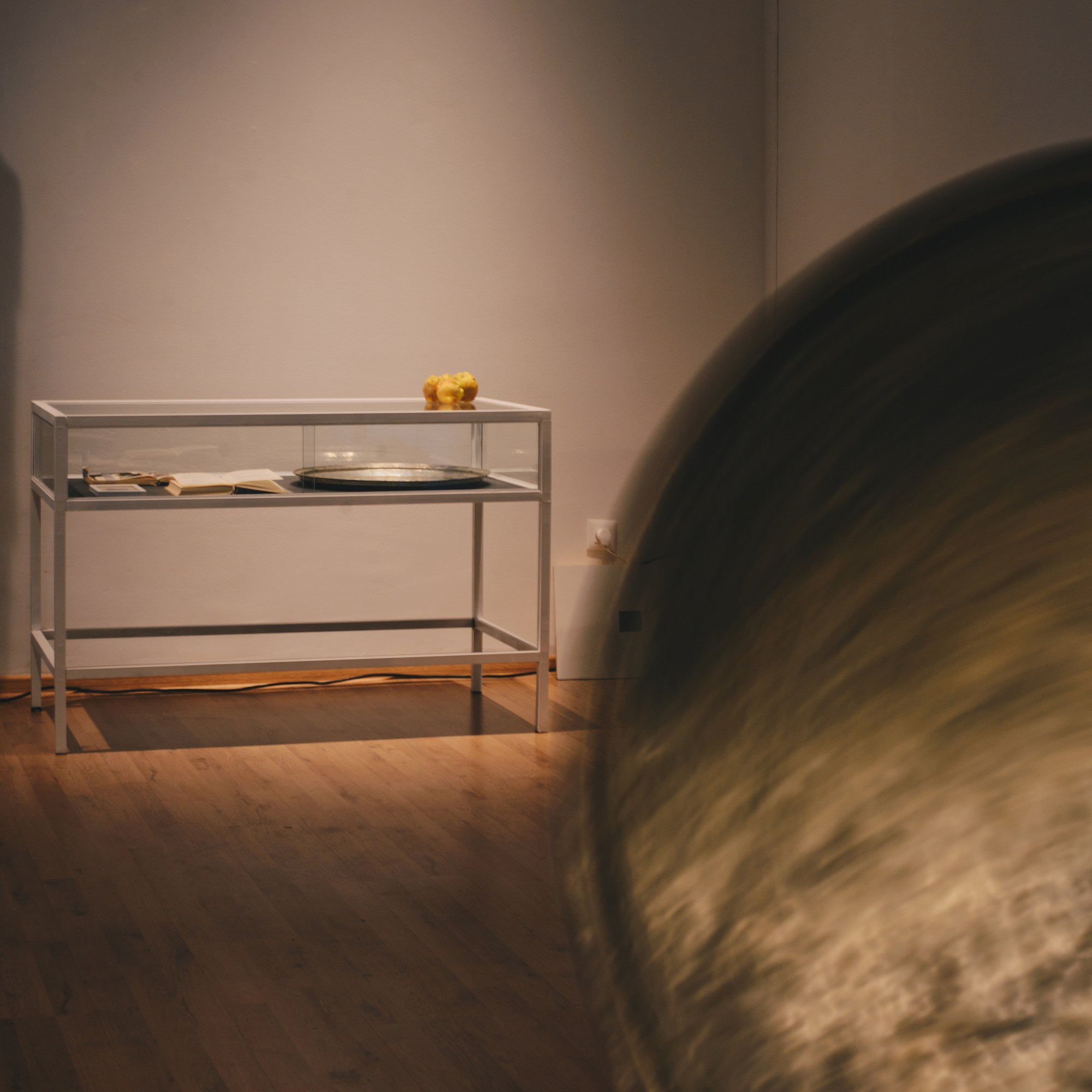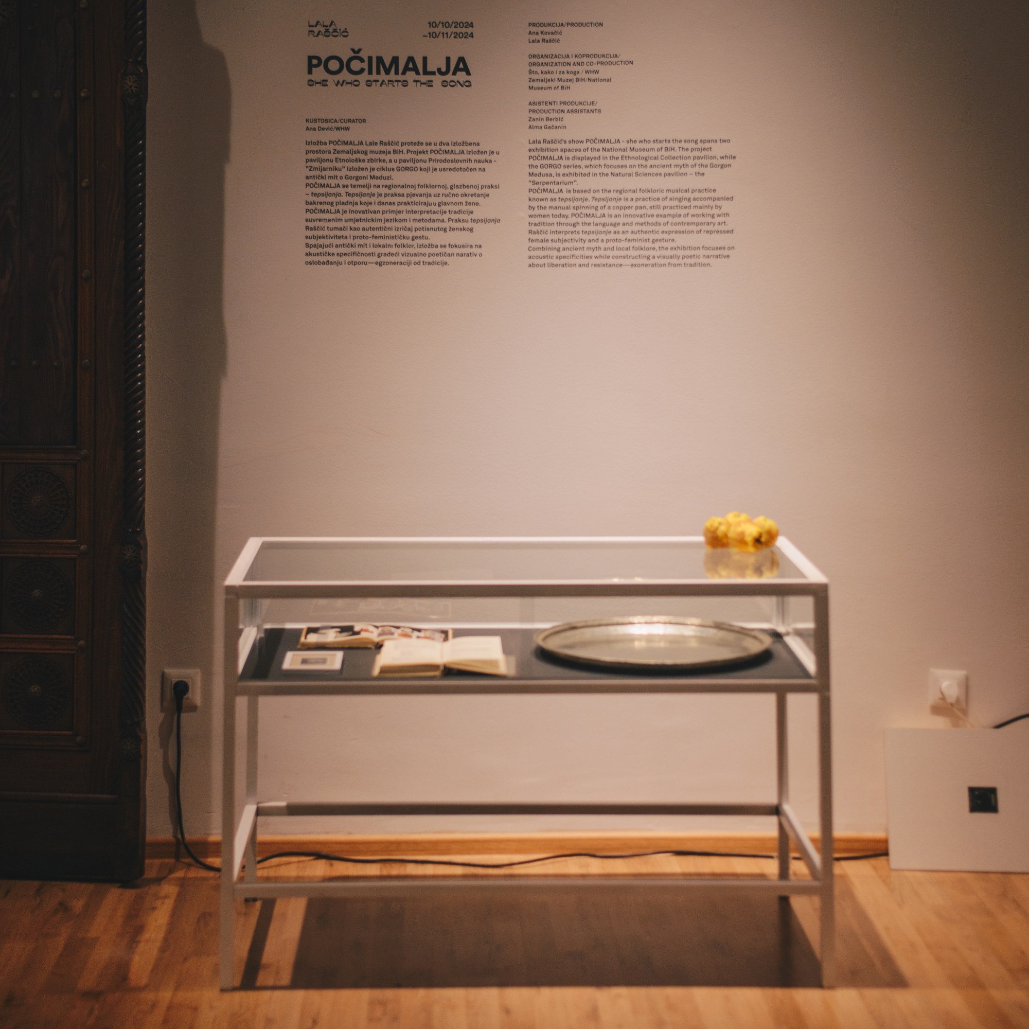 Lala Raščić’s show POČIMALJA – she who starts the song spans two exhibition spaces of the National Museum of BiH. The project POČIMALJA is displayed in the Ethnological Collection pavilion, while the GORGO series, which focuses on the ancient myth of the Gorgon Medusa, is exhibited in the Natural Sciences pavilion – the “Serpentarium“. POČIMALJA is based on the regional folkloric musical practice known as tepsijanje. Tepsijanje is a practice of singing accompanied by the manual spinning of a copper pan, still practiced mainly by women today. POČIMALJA is an innovative example of working with tradition through the language and methods of contemporary art. Raščić interprets tepsijanje as an authentic expression of repressed female subjectivity and a proto-feminist gesture.