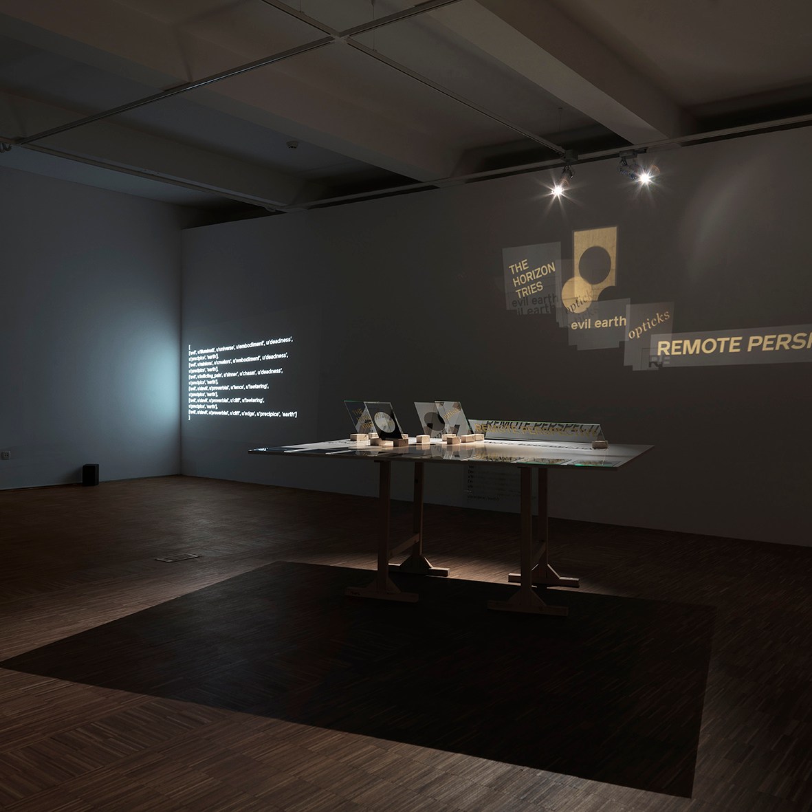 The multilayer glass object points to the stratification of metadata, while simultaneously creating an image overlay and consequently distorting the original image. The perspective play is enhanced by the reflections of words on the walls of the exhibition space that further disperse and fragment the view. These are key words that represent phases of her contemplation and research of optics without the subject and perceptual twist caused by the remote perspective, the consumer deployment of drones and selfie sticks, for example.