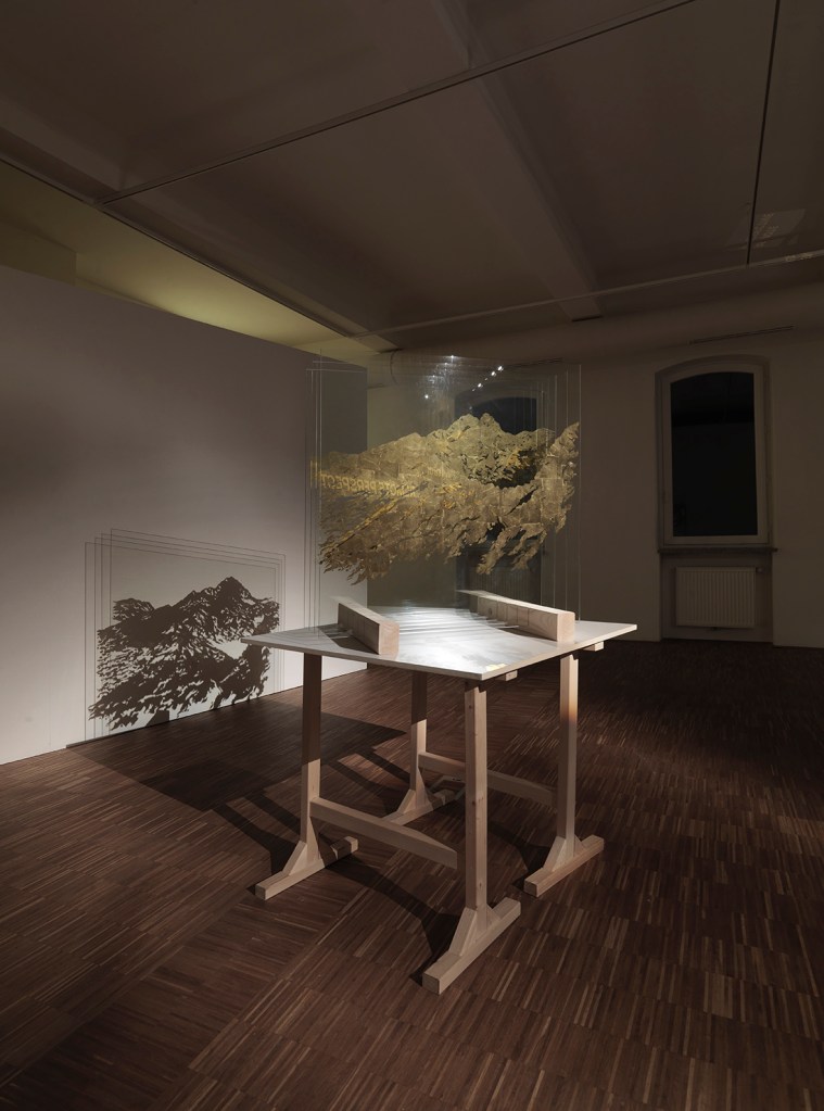 tabletop installation, dimensions variable, glass, 22K gold leaf, paper, wood, light
