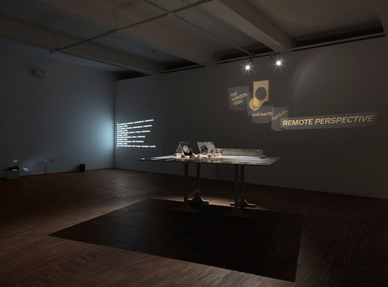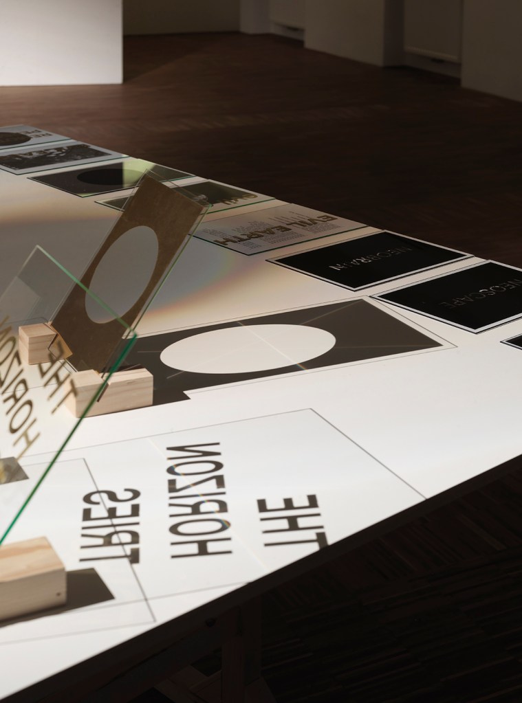 The multilayer glass object points to the stratification of metadata, while simultaneously creating an image overlay and consequently distorting the original image. The perspective play is enhanced by the reflections of words on the walls of the exhibition space that further disperse and fragment the view. These are key words that represent phases of her contemplation and research of optics without the subject and perceptual twist caused by the remote perspective, the consumer deployment of drones and selfie sticks, for example.