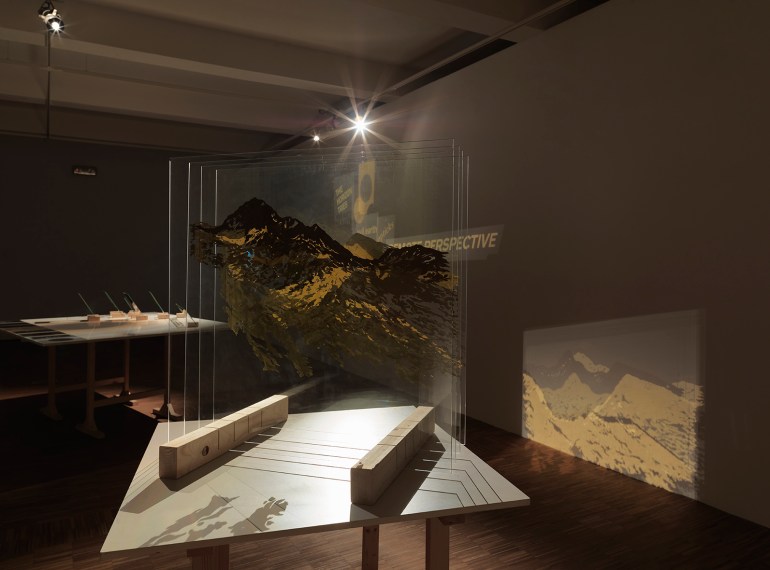 Evil Earth was realised during the CC Tobačna 001, Ljubljana residency and took form as an ambient installation comprised of text and image based reflective objects, projected images, and a 30 minute video essay, exploring the notions of landscape, mountains, new optics, vertical imaging and remote perspective.