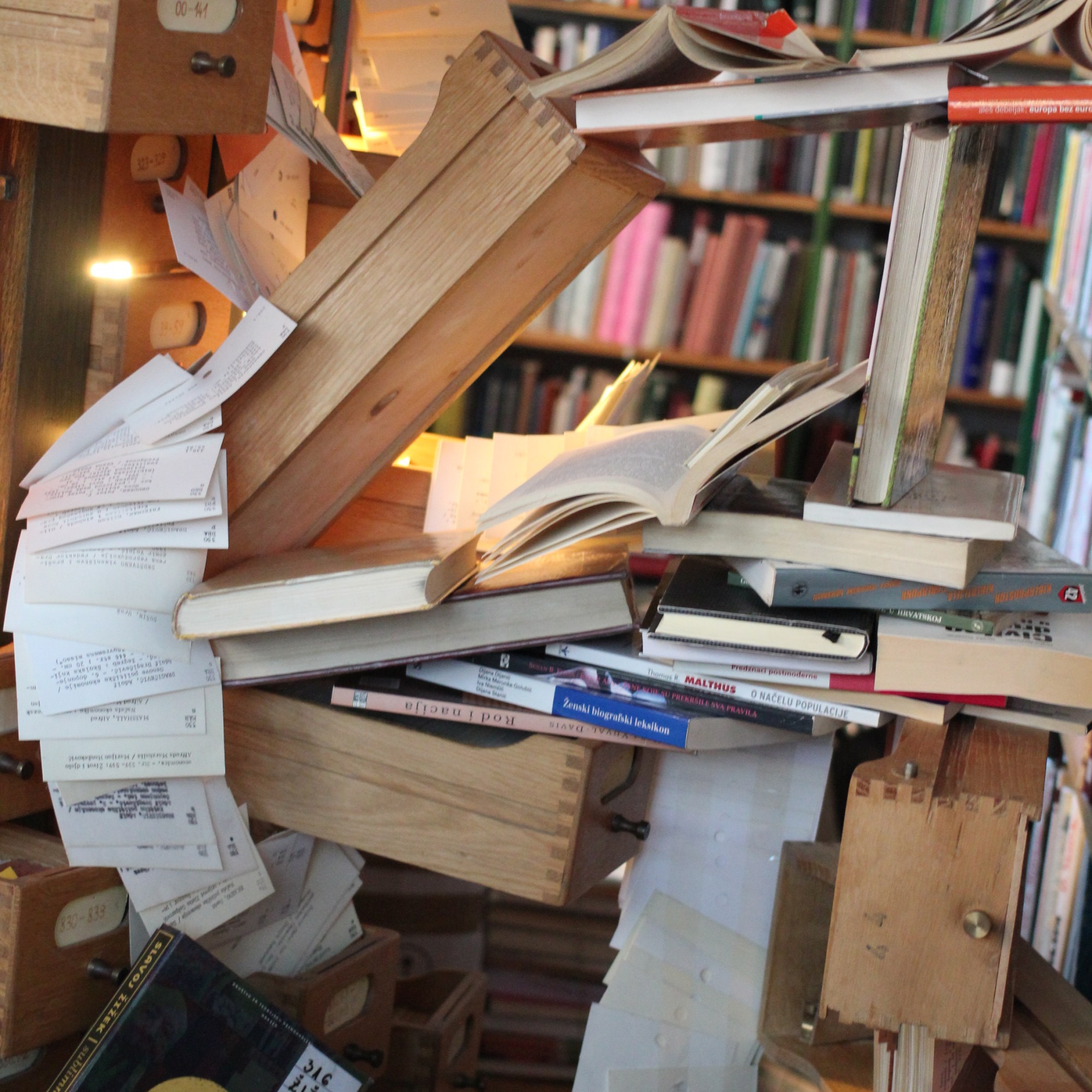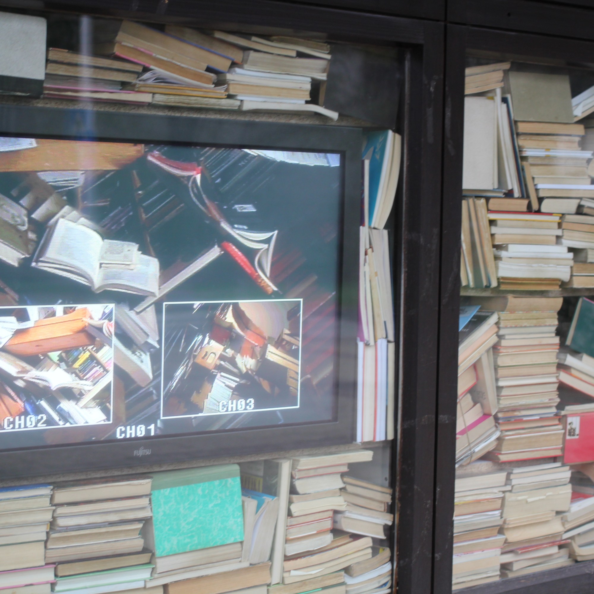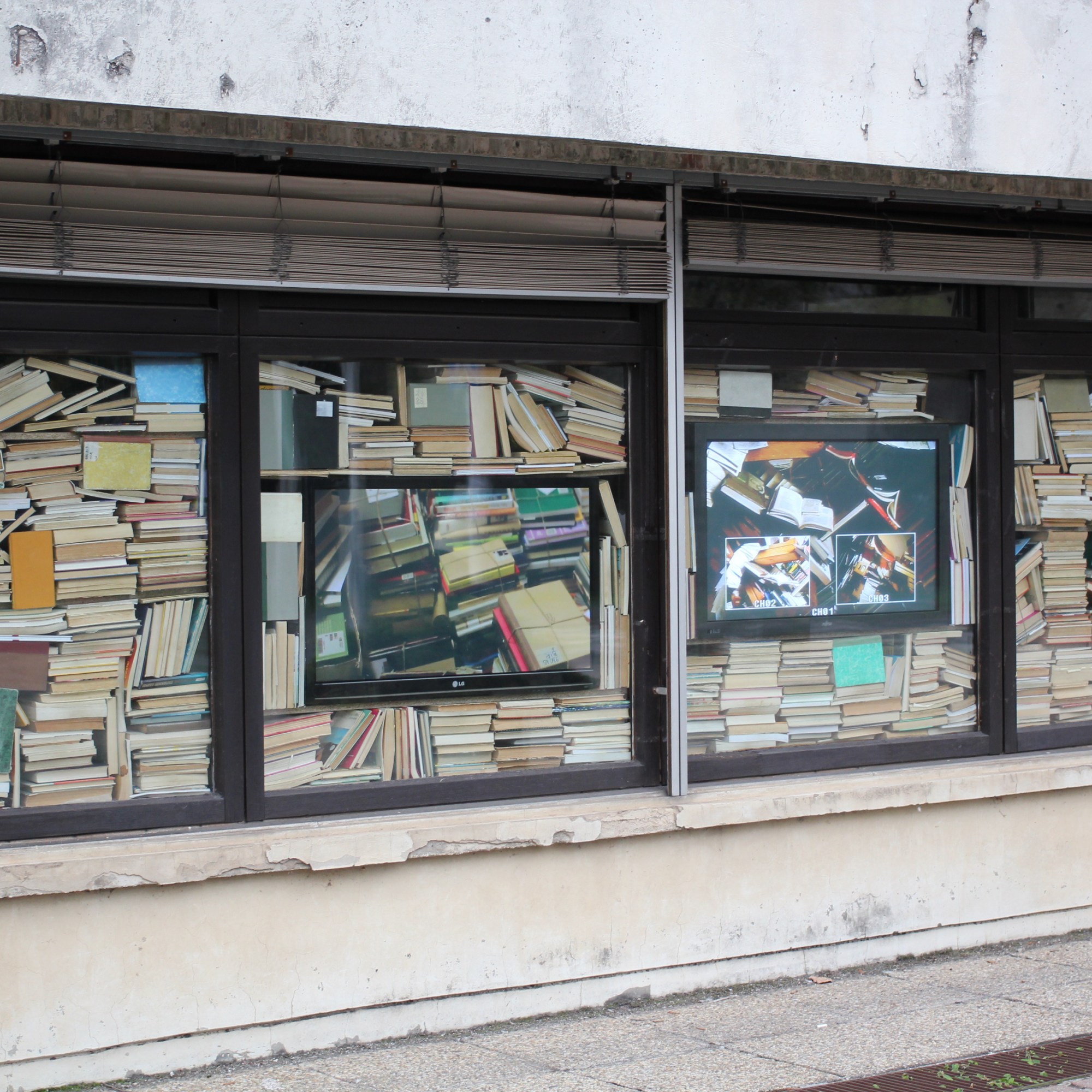 This installation consists of video recordings of the space of the functioning library, its dislocated storage room, and a context- specific intervention in the actual space of the storage room, where the artist uses inventory found on site: an old card catalog, written-off books, redundant filing folders. This intervention could be seen in the window of the library’s gallery as a part of a two- channel video installation.