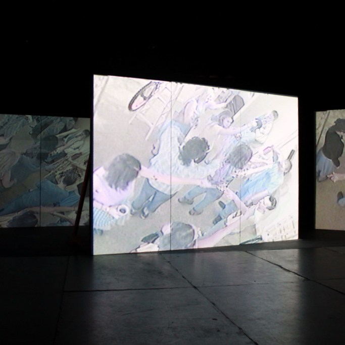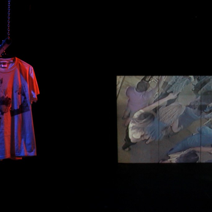 Delivering on the initial promise to mark the closing of the Spaces, Posing Process staged a large-scale, three-channel video installation in the Freeport-McMoRan Theater at the CAC. The installation featured the security camera footage of Flash Mob choreographies and sound bites from interviews with individuals involved with the events and issues relating to the Spaces show, the St. Claude art scene, activism and New Orleans in general. The desk around which the Posing Process plot was initiated was brought into the installation space. Materials gathered and generated at the begginig of the project, which were removed from the gallery space in turn were scattered on the floor.The final element of the installation were custom made t-shirts that were imprinted with collage images derived from the video stills of the security camera footage gathered during the course of the project. These t-shirts were all given away as thank-you gifts for the persons who participated in the project.