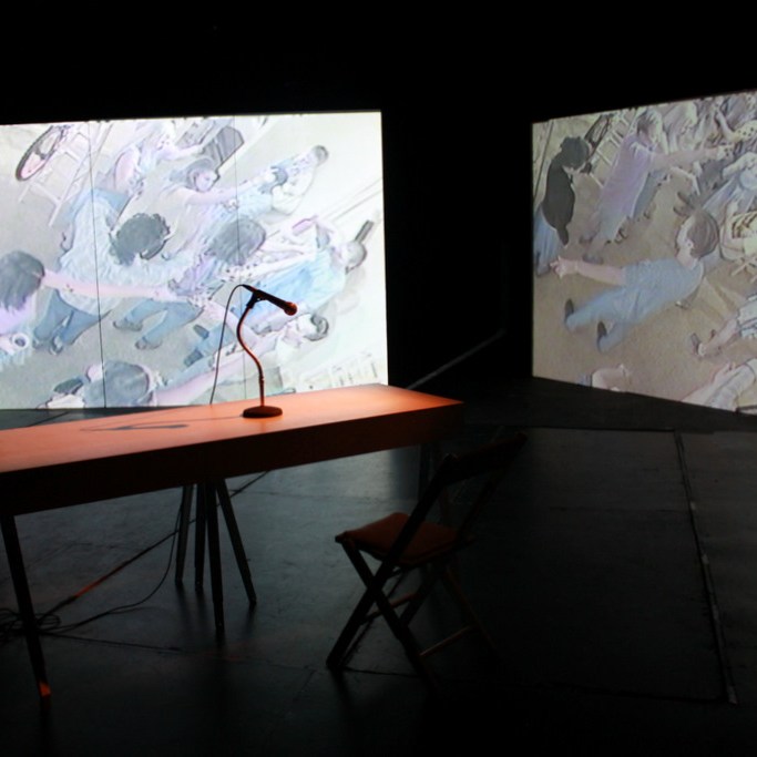 Posing Process started as a symbolic office: a desk was installed in the CAC’s gallery with a promise that, working behind the desk during the course of Spaces, a new multi-media installation would be devised reflecting on collaboration, mutuality, and the energy that is generated through collective action. The project abandoned its post in the CAC’s gallery in March, following a protest of artists in the wake of the resignation of the exhibitions curator. Posing Process continued to develop, off-site, and set its course towards exploring the transformative potential of action in gallery space – organizing Flash Mobs in exhibition spaces and recording security camera footage at gallery openings. A significant part of the footage captured by the Posing Process cameras was the protest action of the Spaces artists removing their work from the exhibition.