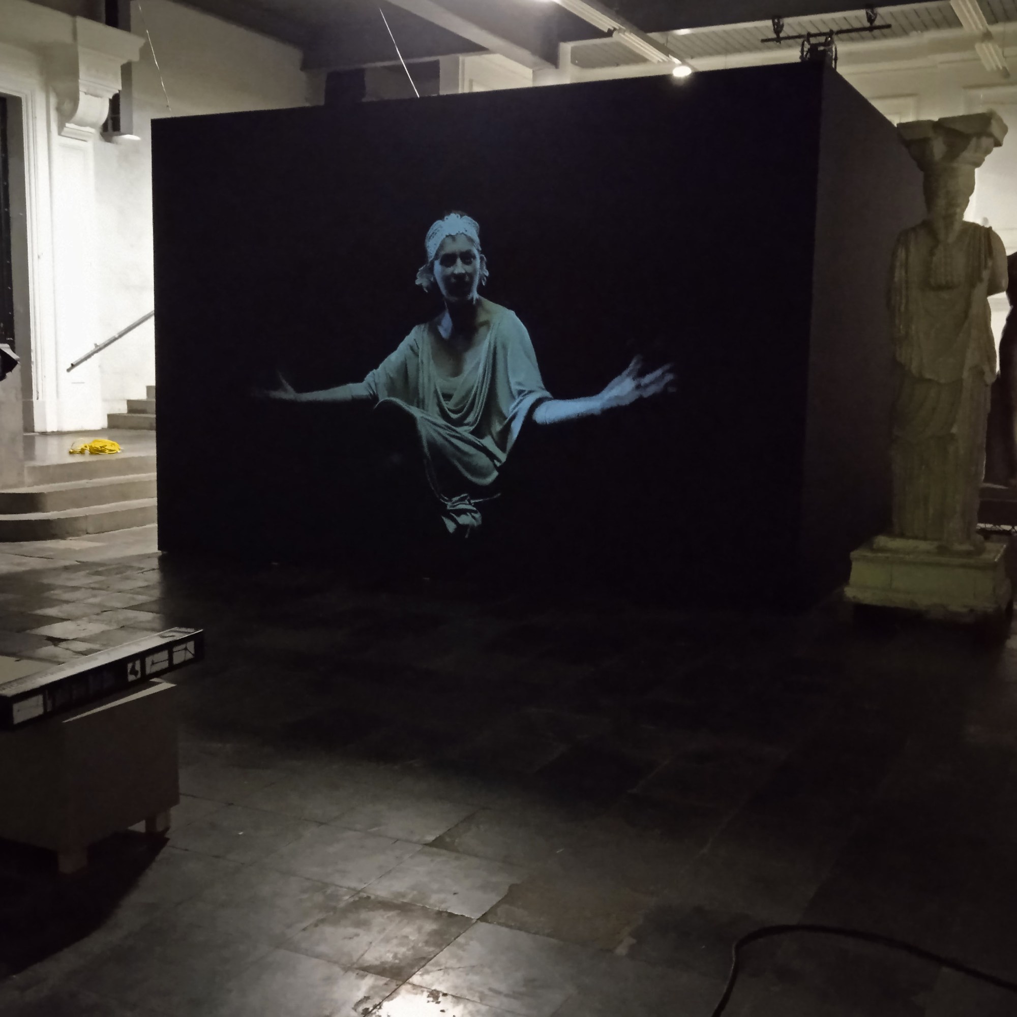 The Eumenides is a video based on J.P. Sartre’s drama The Flies, delivering Act IV as a dénouement to Sartre’s initial three acts. Raščić working with Andreja Dugandžić used text from Sartre and references to ancient Greek mythology, theatre, tragedy, philosophies of existentialism and individualist anarchism in the creation of a new narrative. The plot of Sartre’s The Flies is rooted in the Greek myth of Orestes. Sartre’s drama is a metaphor for non-action and subservience written during the Nazi occupation France. Raščić assumes the roles of Electra and Orestes, while the central motive of the Eumenides, ancient goddesses of revenge, is treated as musical number. The Flies end with Orestes leaving the city of Argos. Rascic continues the story on the premise that Electra, Orestes’ sister inherits the throne. Electra’s traditional tragic role is subverted in this video, showing her as an empowered female figure, a queen, a leader full of ideals, coaxing her subjects toward a better life. Electra’s speech is dripping with ideological and utopian possibilities for a better society. By the end of the video Electra becomes disillusioned with the attitudes of her subjects and decides that the masses are unworthy of such high ideals, they are mired in a Nietzschean slave morality. The video asks: has humanity lost its potential to revolt, are we so alienated in this interconnected world to imagine a healthy society, have we been oppressed so masterfully that we do not fathom real freedom?