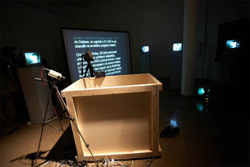 – Peggy PhelanIn the manner of dadaist performance Lala RaπËiÊ reads poetry in the wooden box, while performativity is enhanced by video installation. As we read Peggy Phelan, it gets clear that both, performance as well as poetry see the world through the eyes of metaphor and metonymy, in order to feel the essence of existence and find the way to change things, with the help of nonlinear narrative code, such as similarities, associations and co-ideas.