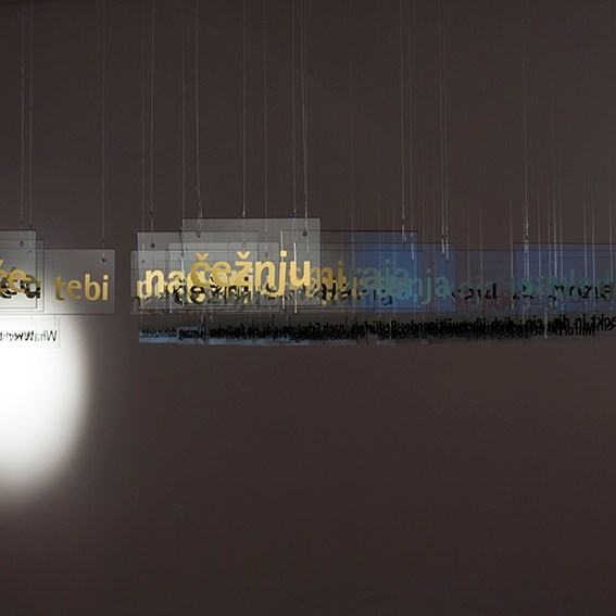 A spatial installation consists of a schematic representation of the translation of the sentence and of the transmutation of the spoken to the written word, painted on glass. The letters are executed in the technique of verre églomisé, a technique of using gold leaf, which is adhered to glass, resulting in a mirror-like, reflective finish.
